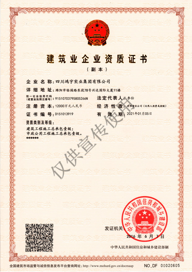 近年来,公司坚持以市场为导向,根据社会需求提供独具特色的高质量产品,先后完成各类房屋建筑、装饰装修、桥梁水利、市政建设等工程100余项,其代表工程有鸿宇商业广场、鸿宇中心、科技城电梯产业园、郁金香生活广场、建设银行综合楼、成都教育学院教学大楼、盐亭县世行贷款一期、二期项目、盐亭县嫘祖大道等。工程合格率100%,履约率100%,优良率93%,满意率96%。公司目前正在着力打造绵阳市游仙区东津路8号棚户区改造项目,并与蓝城集团合作在绵阳市涪城区杨家镇共同打造中国(绵阳)国际康养小镇。